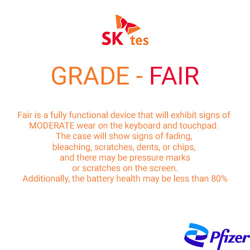 - Fair is a fully functional device that will exhibit signs of MODERATE wear on the keyboard and touchpad. The case will show signs of fading, bleaching, scratches, dents, or chips, and there may be pressure marks or scratches on the screen. Additionally, the battery health may be less than 80%