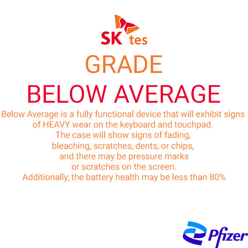 - Below Average is a fully functional device that will exhibit signs of HEAVY wear on the keyboard and touchpad. The case will show signs of fading, bleaching, scratches, dents, or chips, and there may be pressure marks or scratches on the screen. Additionally, the battery health may be less than 80%.